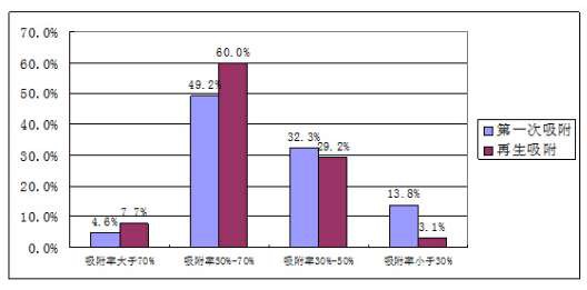 抽檢報(bào)告顯示,第一次試驗(yàn)后35批次樣品的甲醛吸附效率大于50%,可認(rèn)定為吸附效率較高;而經(jīng)過(guò)再生后,較高吸附率產(chǎn)品占67.7%,數(shù)量明顯增加。宋紅波工程師表示,這表明暴曬可以使使用過(guò)的活性炭達(dá)到再生的目的。